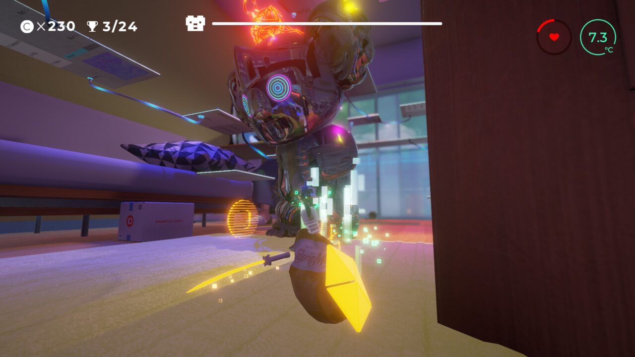 操作は攻撃・防御・回避・ジャンプとシンプルだが、こちらの体力は低めで、なかなかハードな難易度になっている。チェックポイントらしきものはなく、やられると最初からのリスタートになるので気をつけて立ち回ろう。