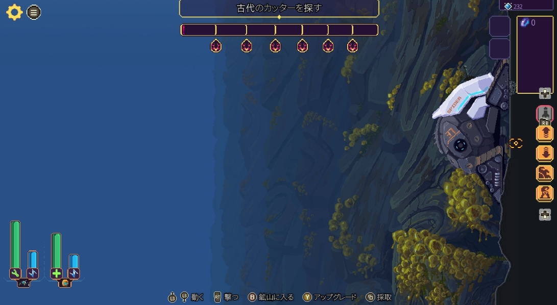 採掘面でちょっとした不満点は、資源を掃除機みたいなもので吸い込むのですが、変な慣性のせいで資源があっちこっち飛んでいってしまうのが少しストレス。