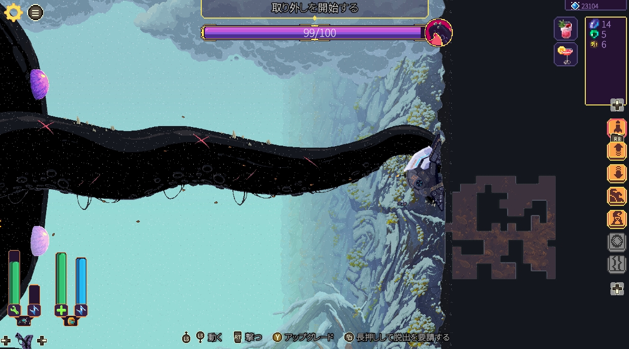と2つの使い道があって、クリアのための強化は最低限にして、できるだけたくさん資源を持ち帰ってしまうのが理想的。鉱山で掘れるのは資源以外にも、モジュール、武器パーツなどがありますが、数は少なく完全にランダムで手に入るのでビルド要素は正直薄いです。