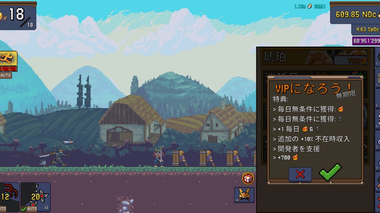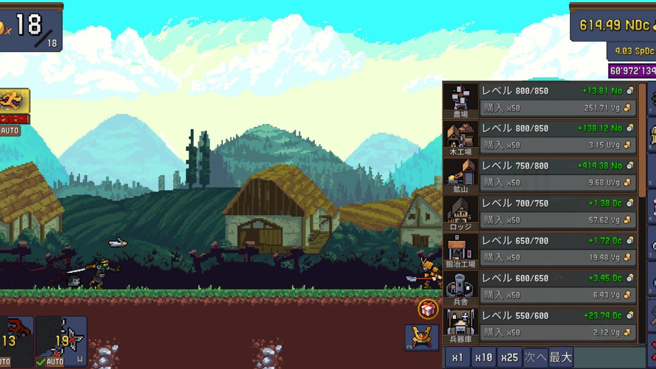 自然を駆け抜け、敵をひたすら斬り、村の施設を買う、そんなシンプルな内容。コツコツとお金が増えるのが快感で、なんとなく毎日やってしまう中毒性があります。