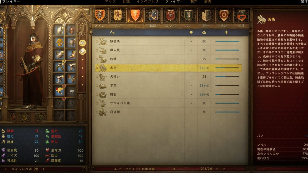 ステータスは「馬術」「隠密」「片手剣」など多岐にわたります。