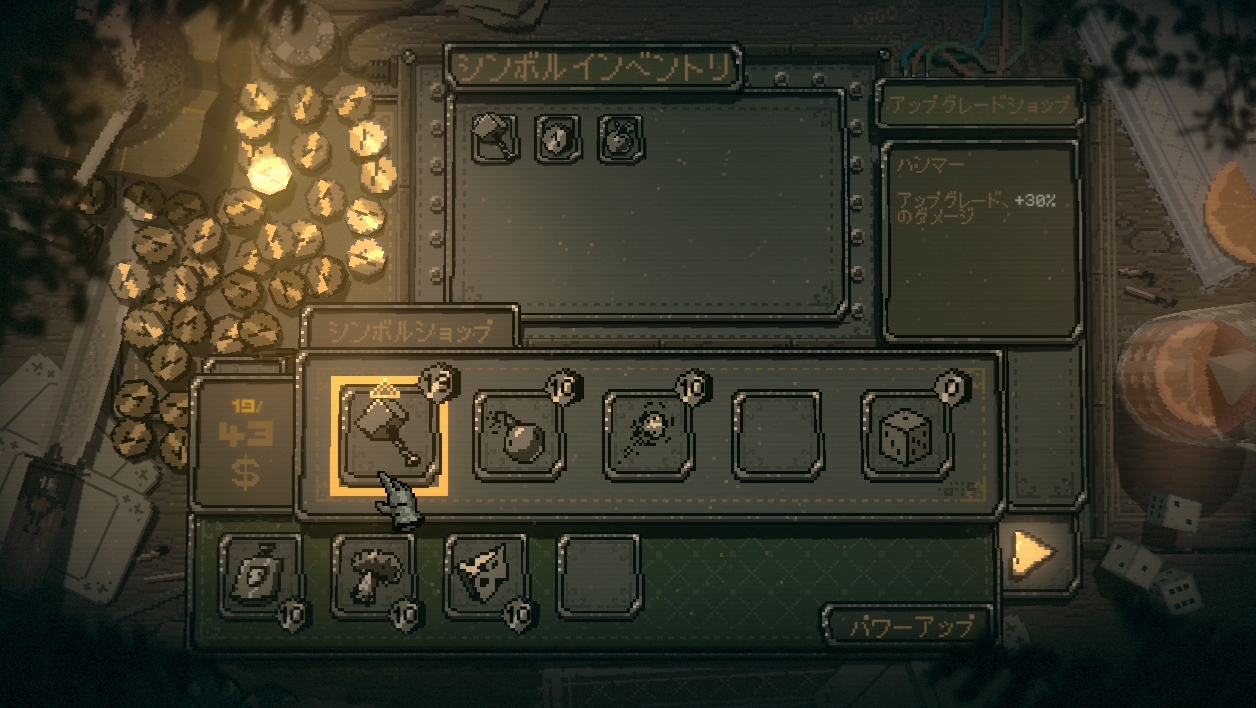 ここでスロットの絵柄まで買えちゃうのが面白く、絵柄を変えることで色々なビルドが楽しめます。ハンマーとリール再始動で一生スタンさせ続けたり、毒の剣を盾で耐えながらチクチクしたり・・・ここはちゃんと望んでいるローグライクでした!
