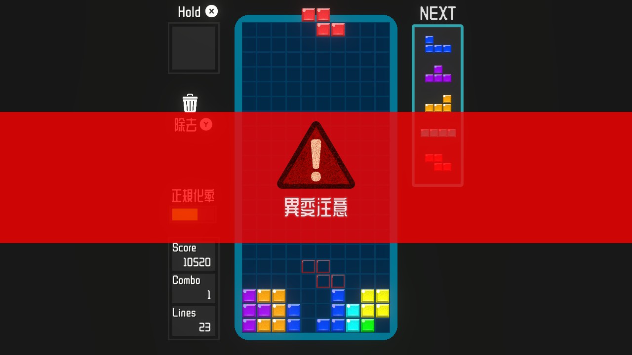 異変を見逃すとお邪魔ブロックが下からせり上がってきます。テトリスとしての難易度は低いですが、このペナルティが重いので、ちゃんと異変を察知する観察力が求められます。
