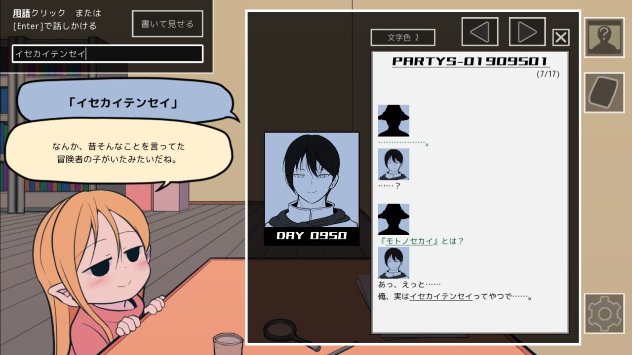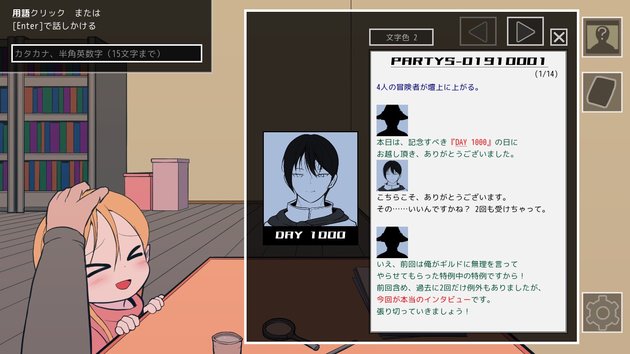 インタビューやイベントなどの記録は過去1000日分あるので、ギルド加入からキャラやパーティの状態は徐々に変化していくのがわかります。なのでこのキャラはこういう性格なんだろうな、みたいな最初の思い込みが実は違って、後々になってひっくり返るのが面白いです。