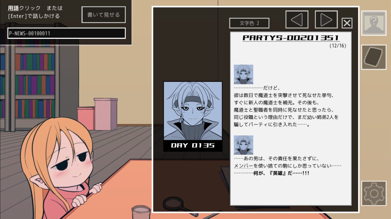 プレイヤーは足の不自由な「記録士」のおじさんとなり、助手の女の子とともにバラバラになった冒険者ギルドの情報をまとめていきます。