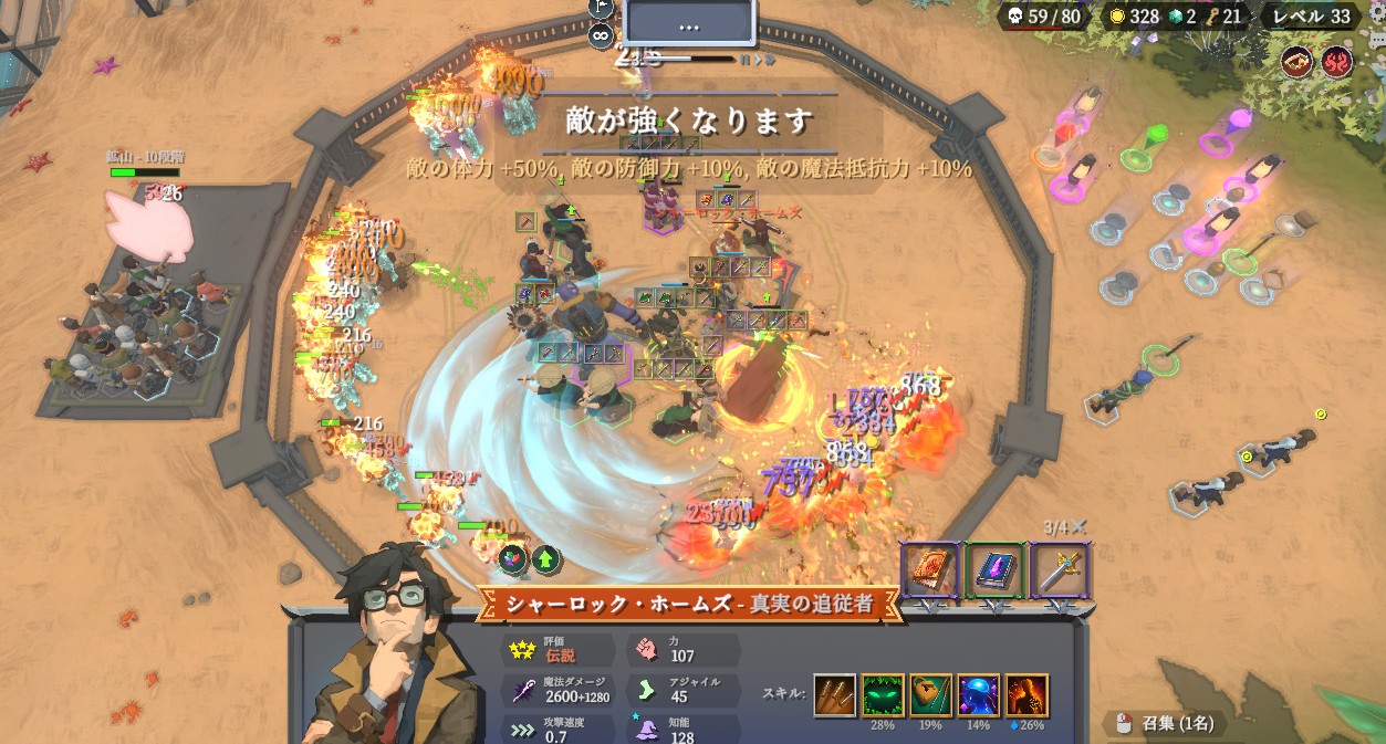 ユニットは、ゾンビ、子供、農夫などなど・・・最初は頼りないですが、合成することで上位のユニットに生まれ変わります。合成を繰り返すことで最終的に「ジャンヌ・ダルク」や「シャーロックホームズ」といった伝説上の英雄へと進化させることができます。