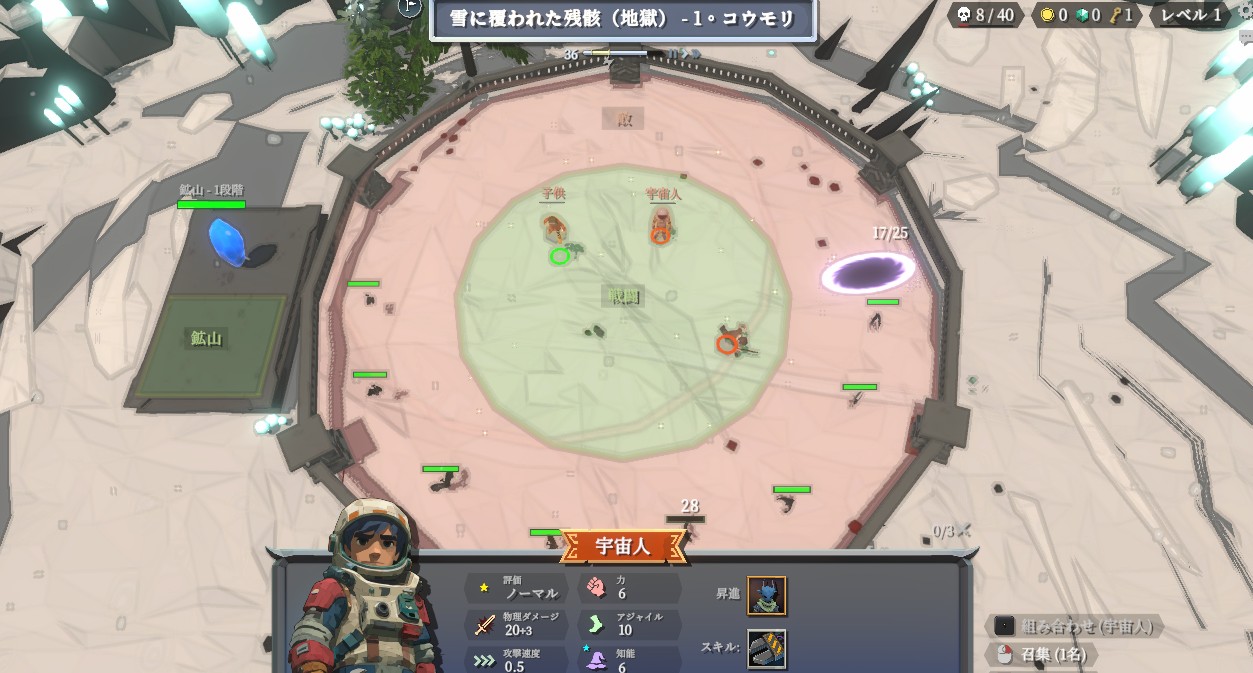 タワーディフェンスといえば少ない配置場所でやりくりするイメージが強いですが、円内のスペースは広いので配置の場所はあまり重要じゃないです。弱いユニットを並べても火力が足りなくなるので、早い段階で強いユニットを作るのがとにかく大事。