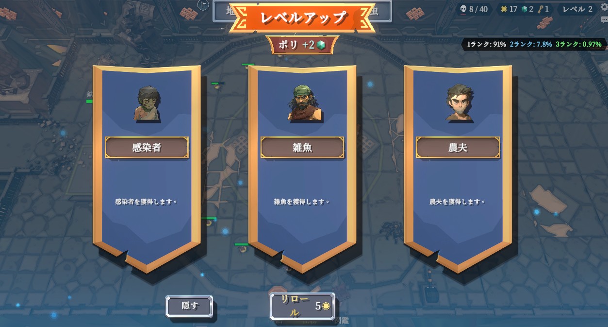 ユニットの入手は流行りのローグライク仕様。お店で購入・レベルアップ時にランダムでユニットや装備が手に入り、毎回違う構成を試せるのが楽しいです。